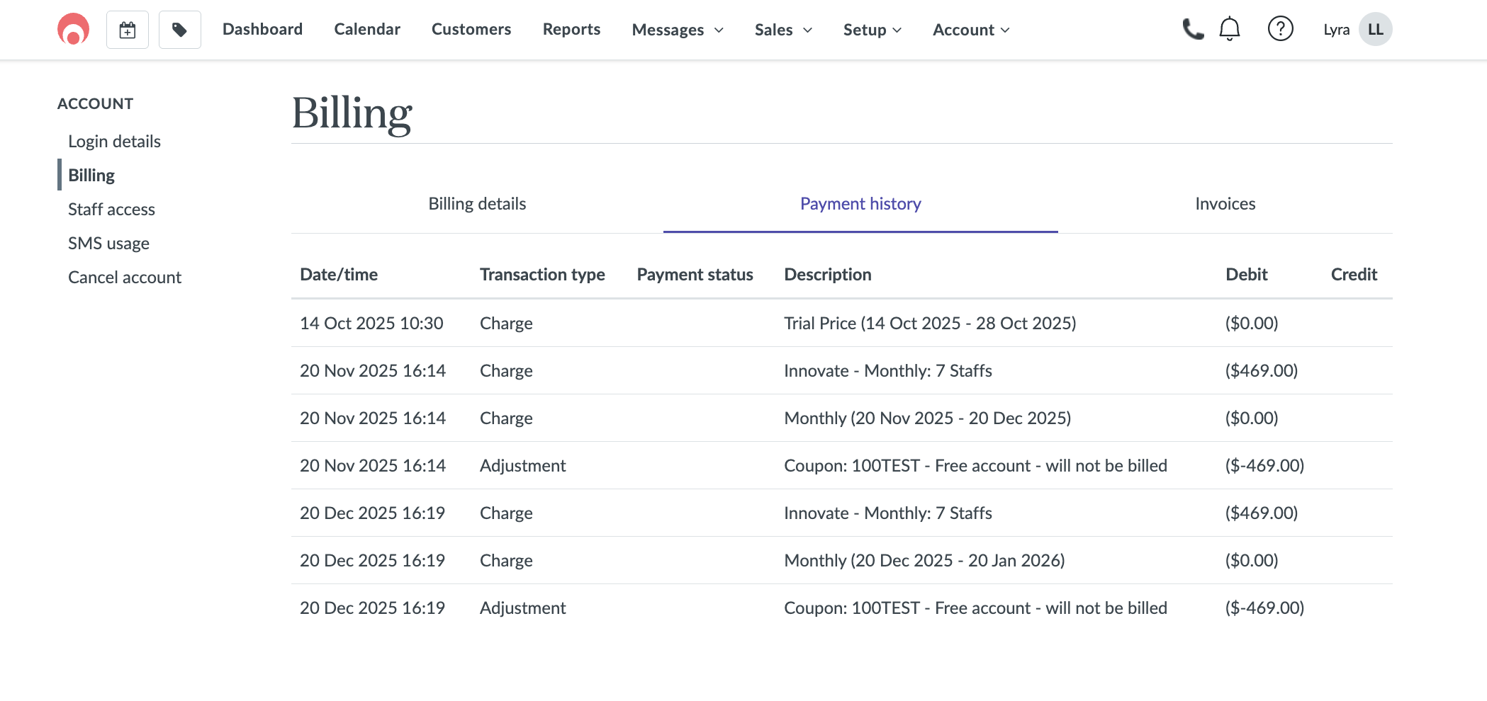 You can view your payment history in detail, which will show all charges and payments made against your account, which includes both your regular subscription and any purchased SMS Credits.
